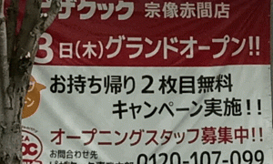 「くりえいと南」の交差点の「福岡銀行」の隣にあった「さかえ屋」が撤退し、その跡が「ピザクック 宗像赤間店」になるようです。オープンは「5月3日(木)」という告知が行われていました。